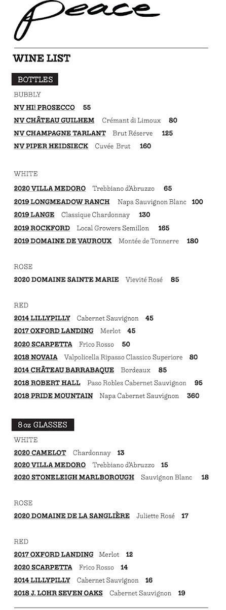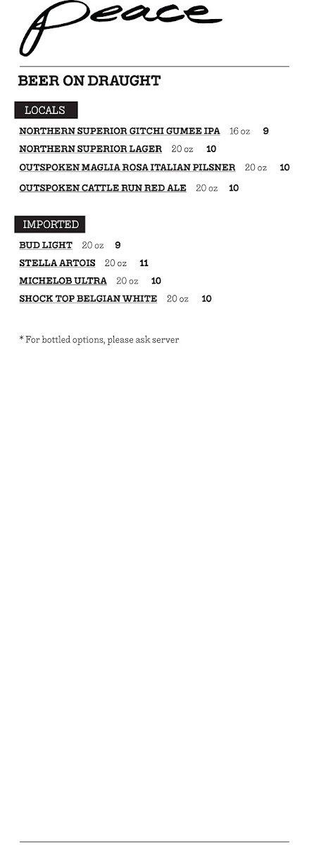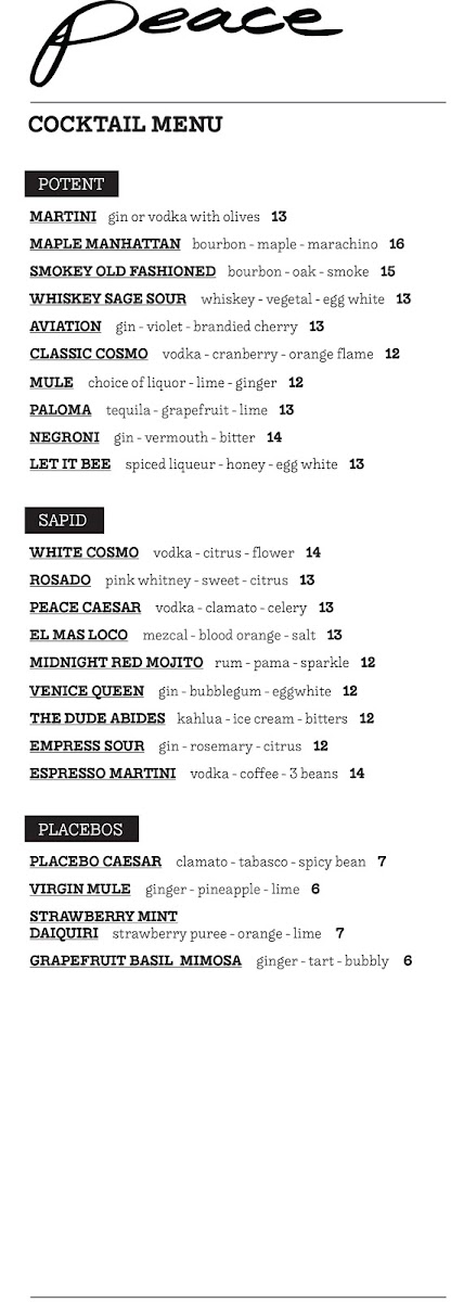 If you're in the mood for a delightful drink, Peace Restaurant offers a fine selection of imported beers like Bud Light, Stella Artois, and Michelob Ultra, as well as unique cocktails. Be sure to try their signature Placebo Caesar or the refreshing Strawberry Mint Daiquiri, both perfect companions to your meal.
